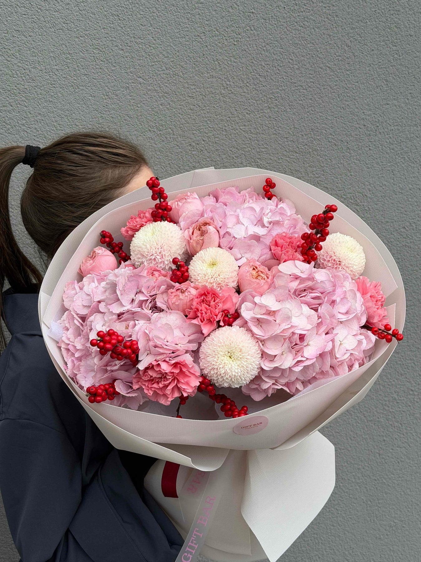 Skład bukietu: hortensja, róża gałązkowa, chryzantema, goździk, ilex.