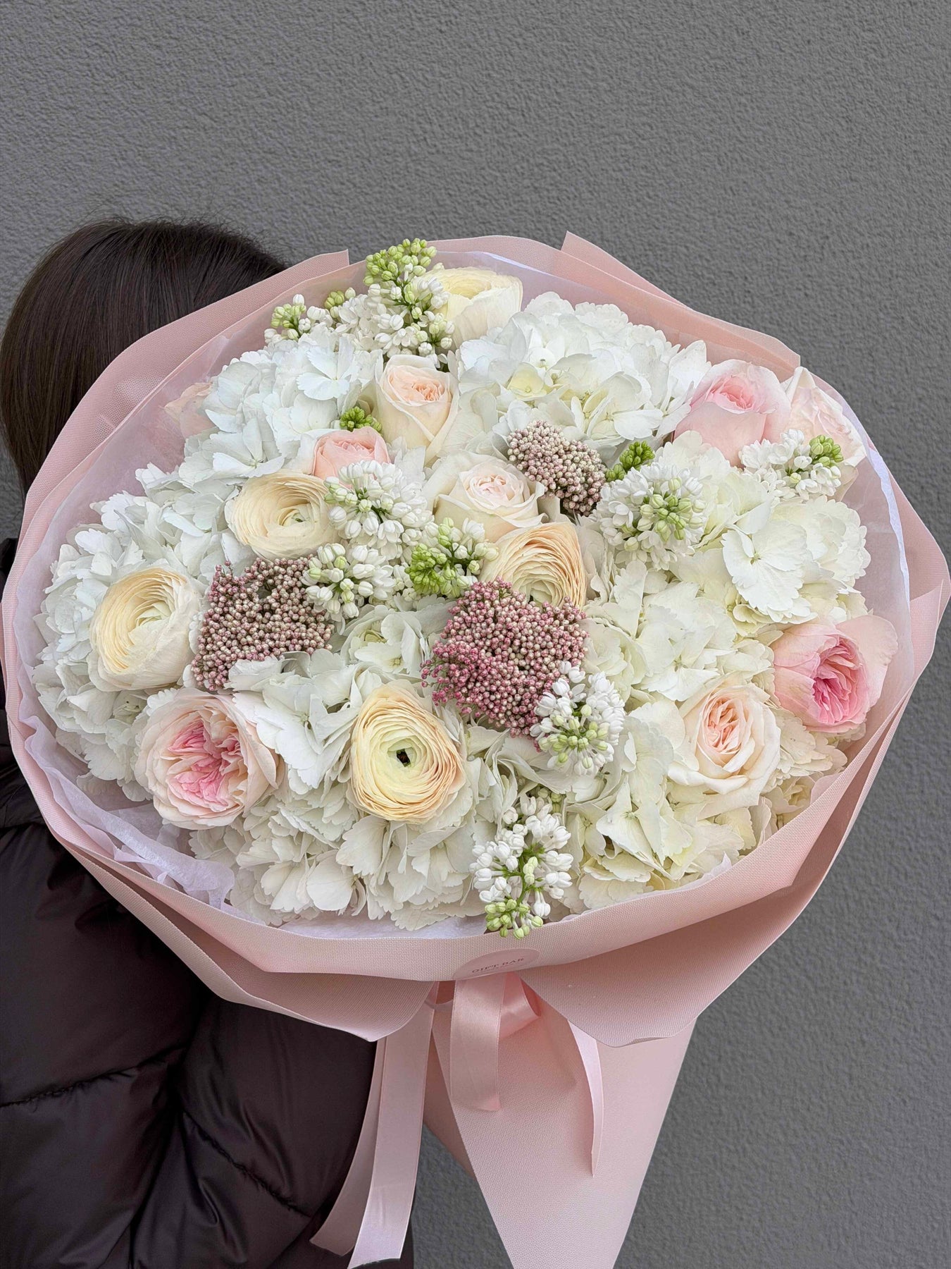 Skład bukietu: hortensja, róża, ranunculus, ozothamnus, bez.
