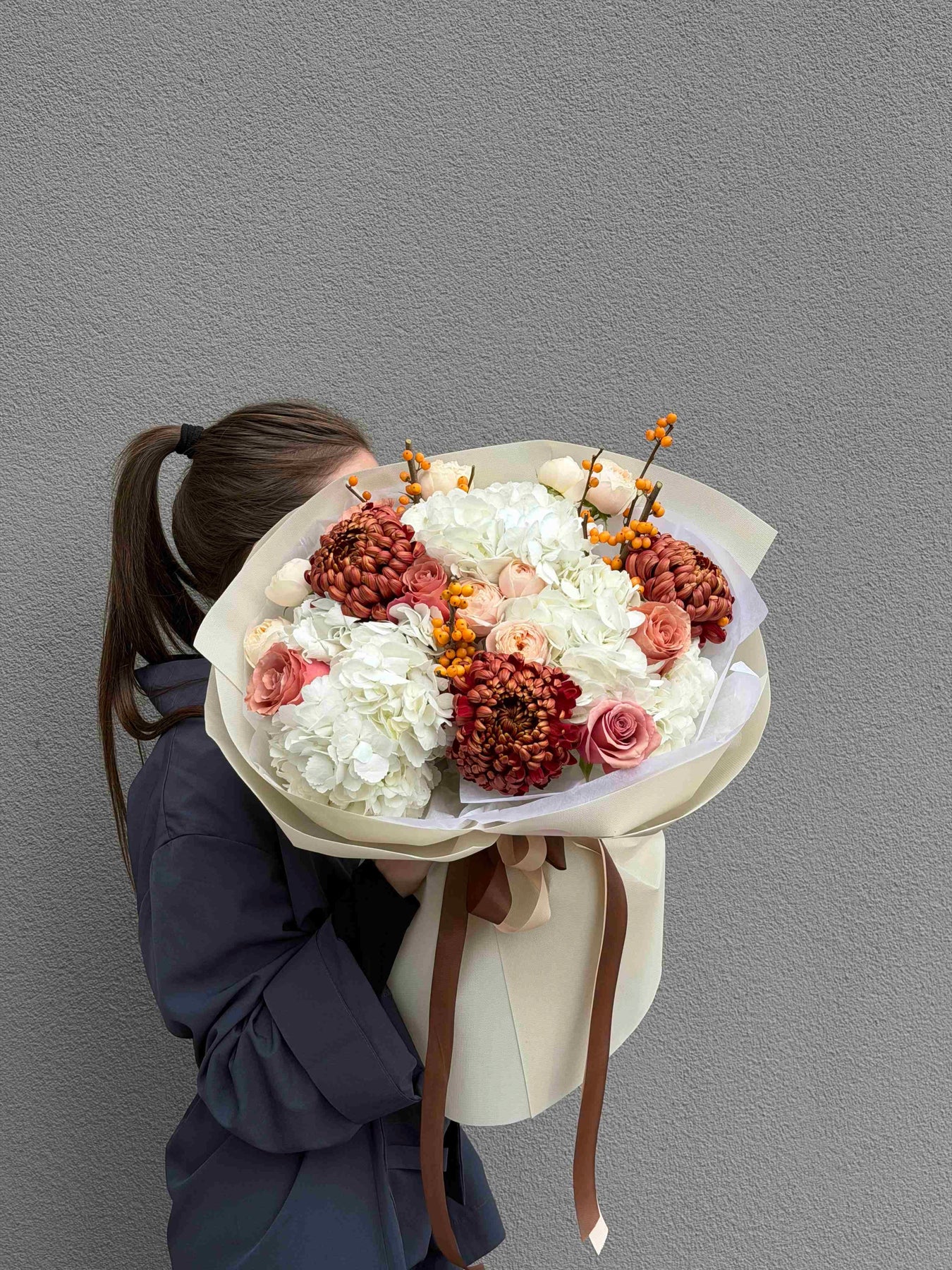 Skład bukietu: hortensja, róża, róża gałązkowa, ilex, chryzantema.