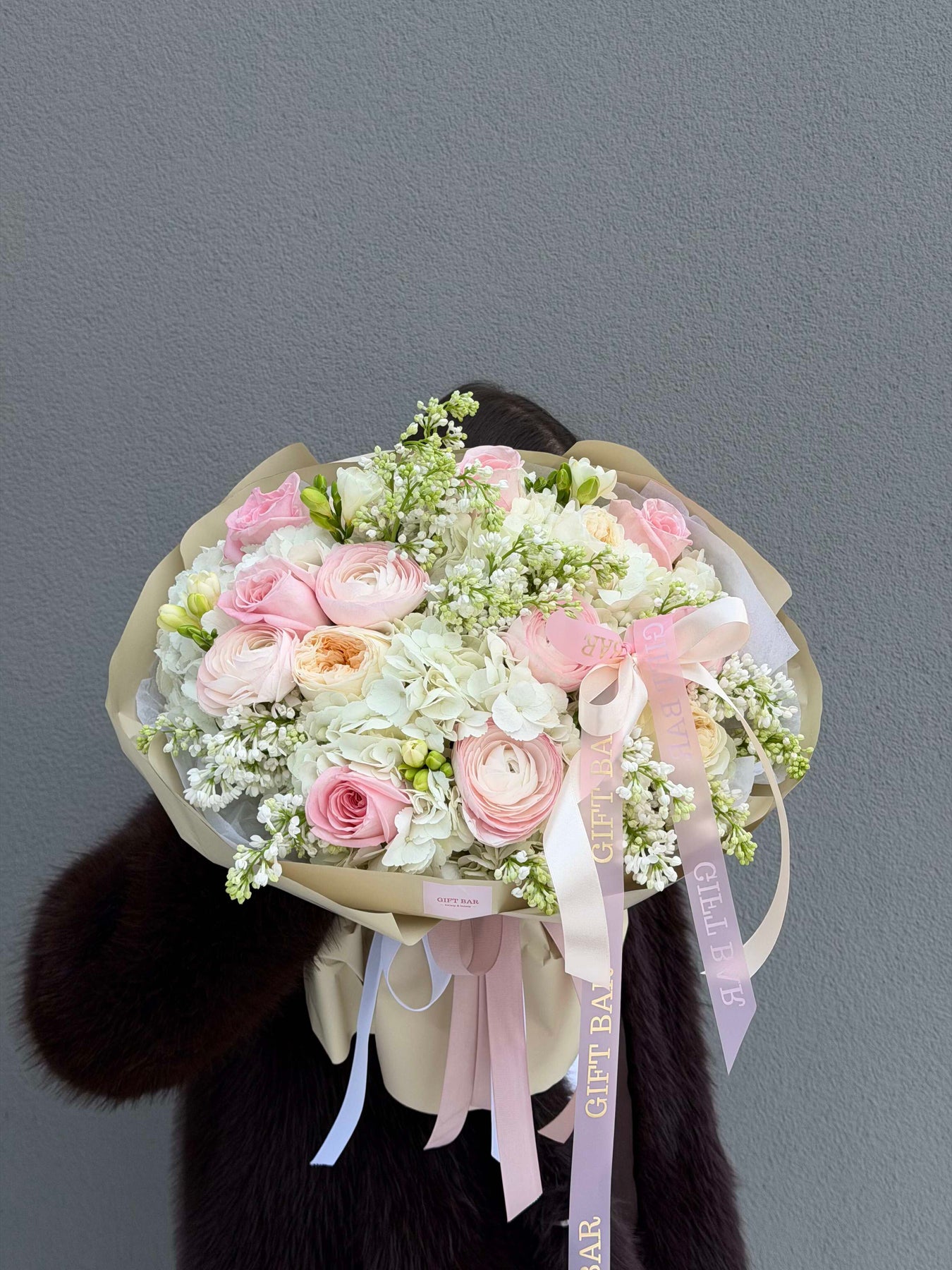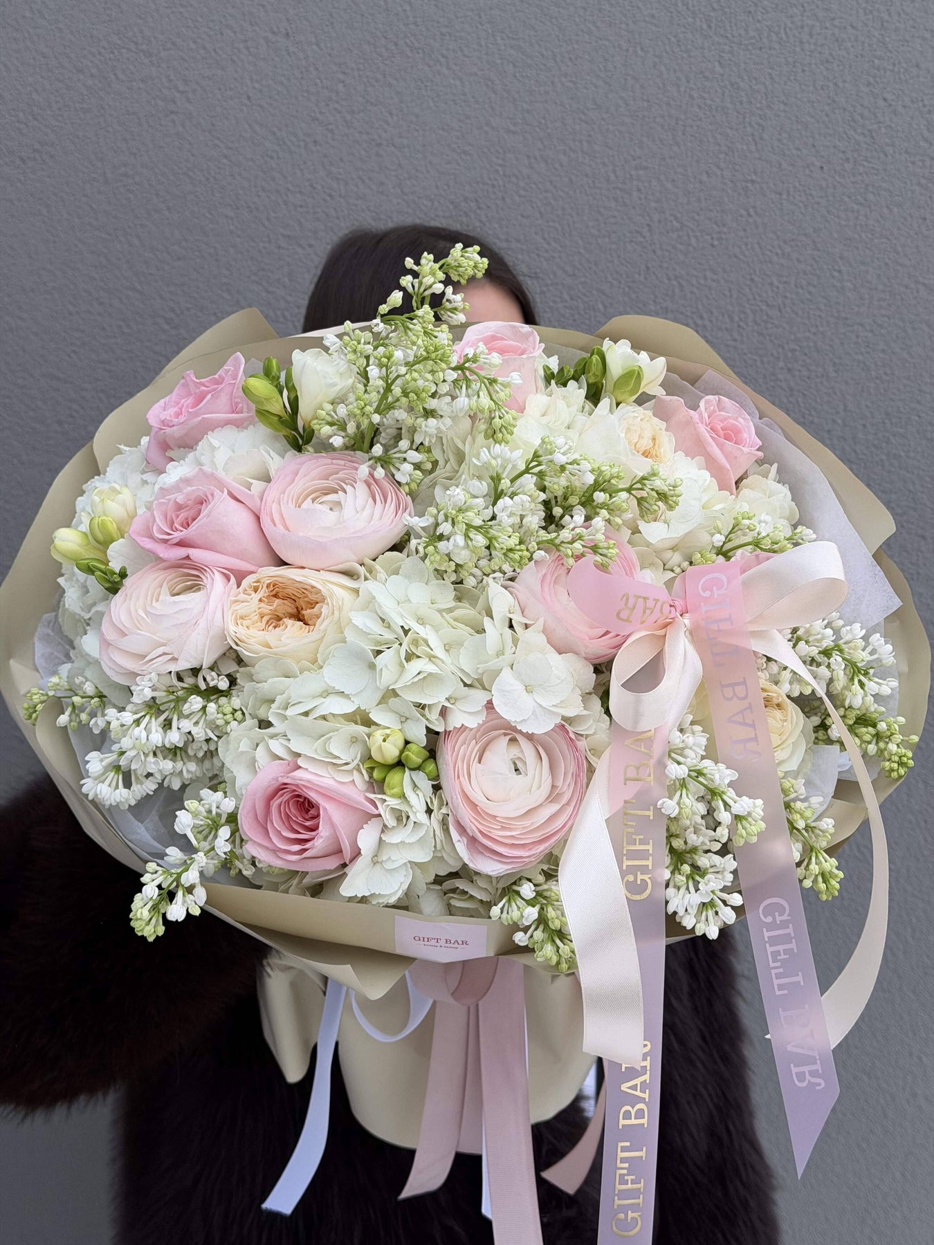 Skład bukietu: hortensja, róża, ranunculus, bez, frezja.
