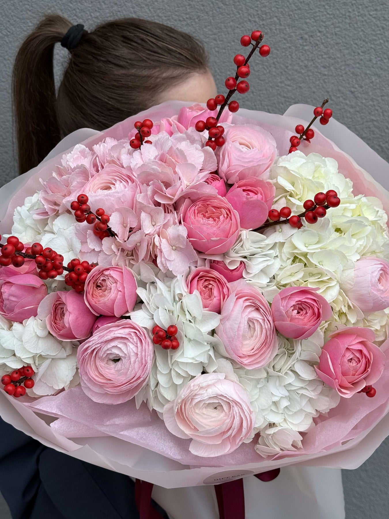 Skład bukietu: hortensja, róża gałązkowa, ilex, ranunculus.
