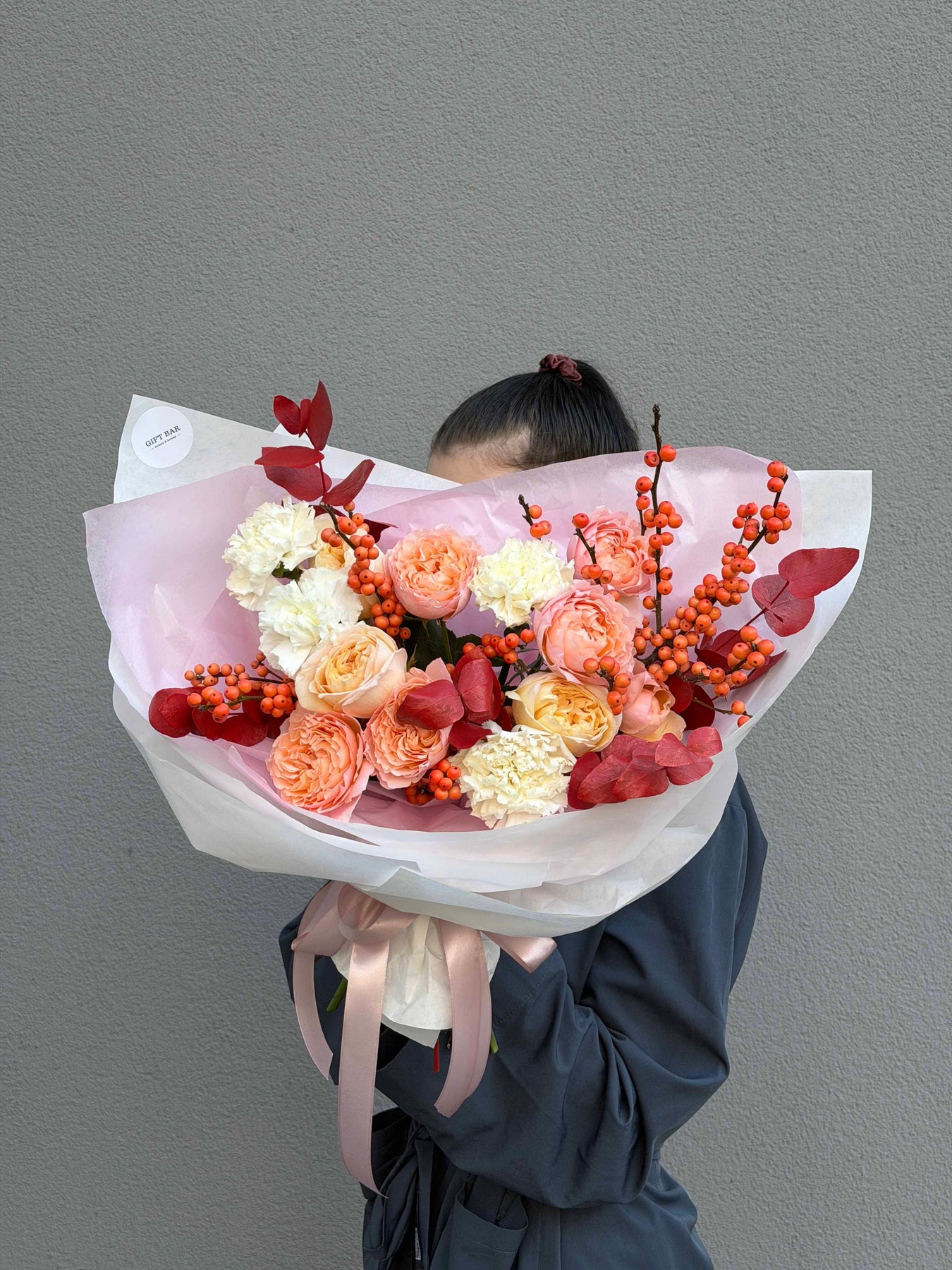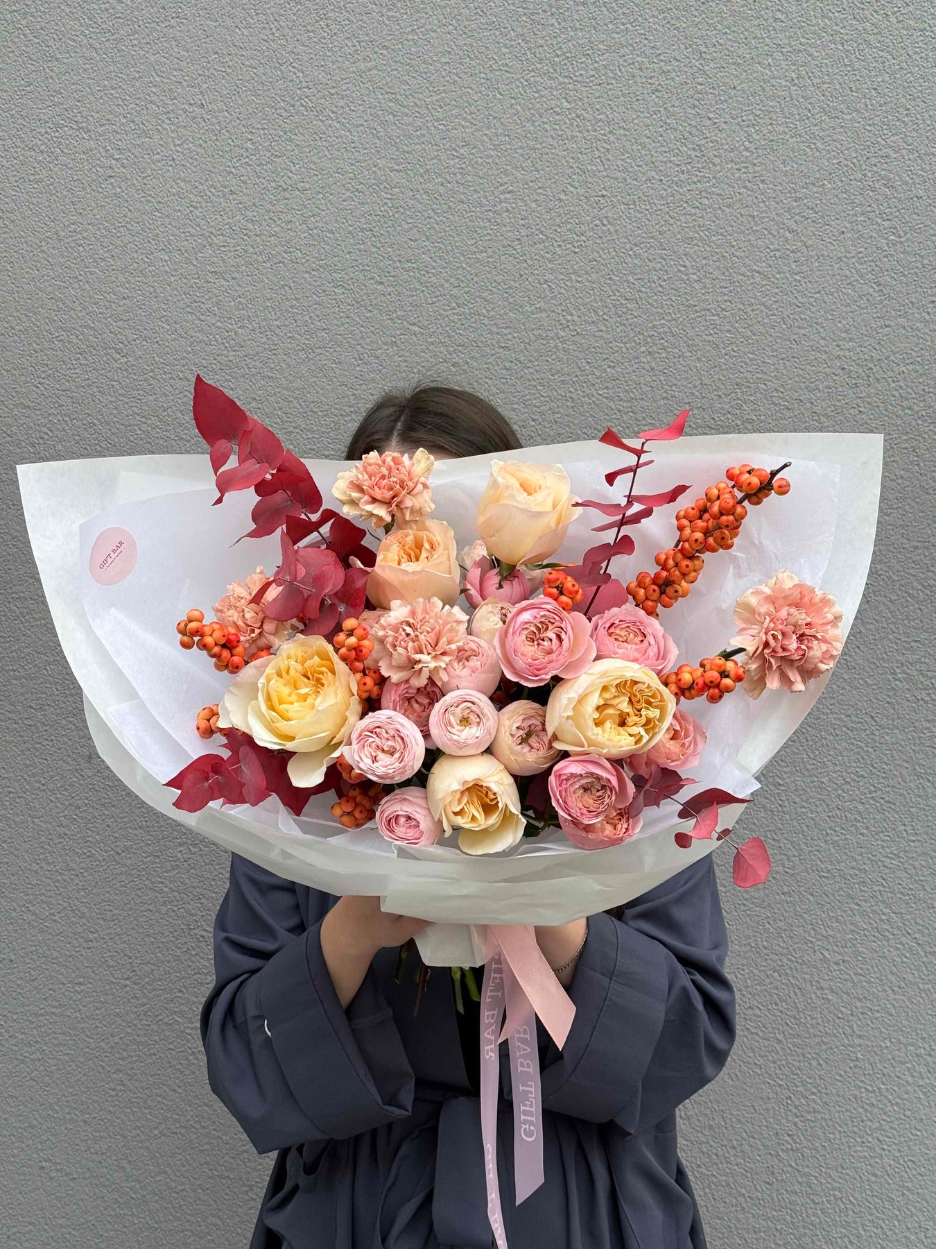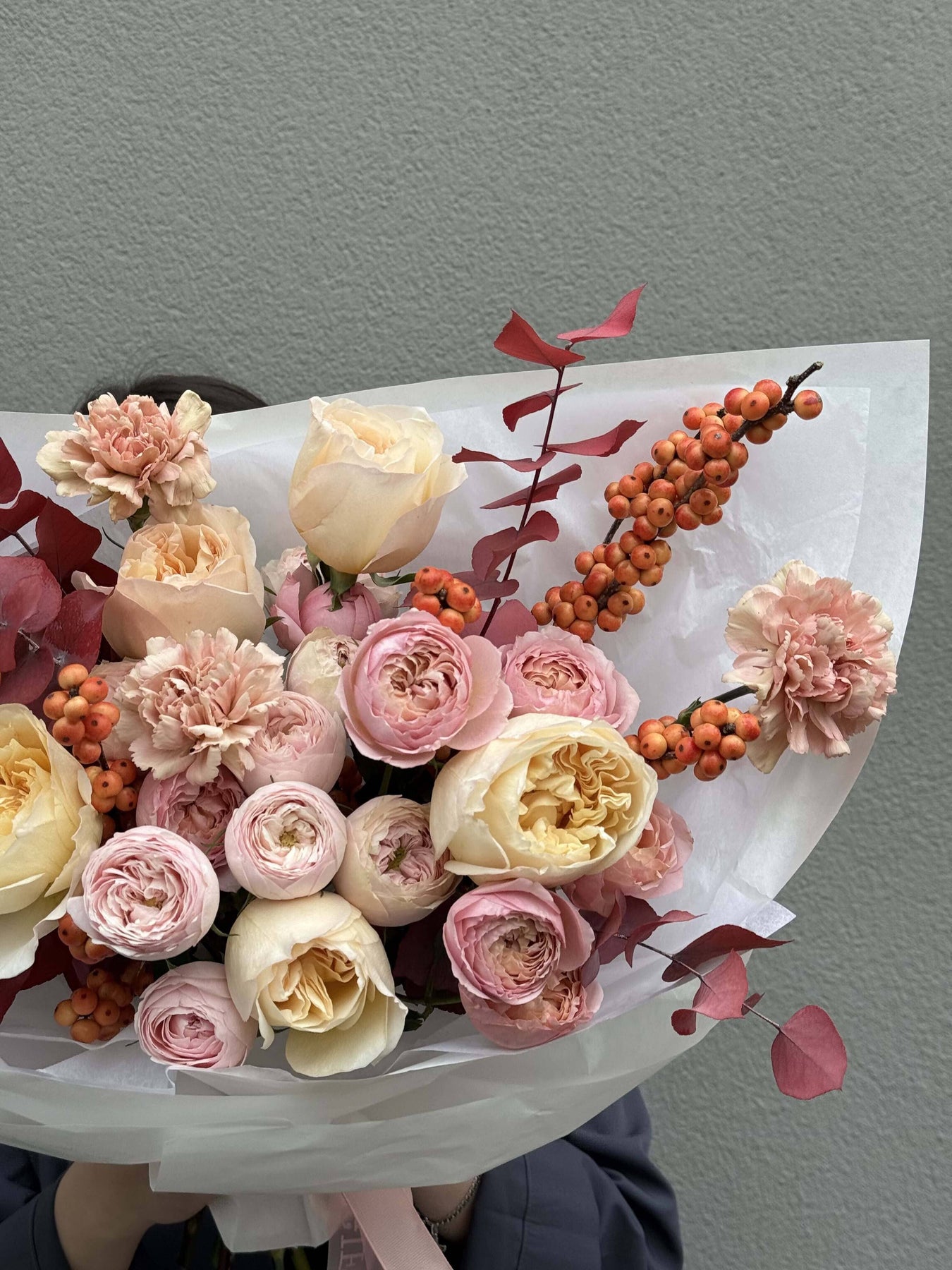 Skład bukietu: ilex, róża, goździk, eucalyptus, róża gałązkowa.