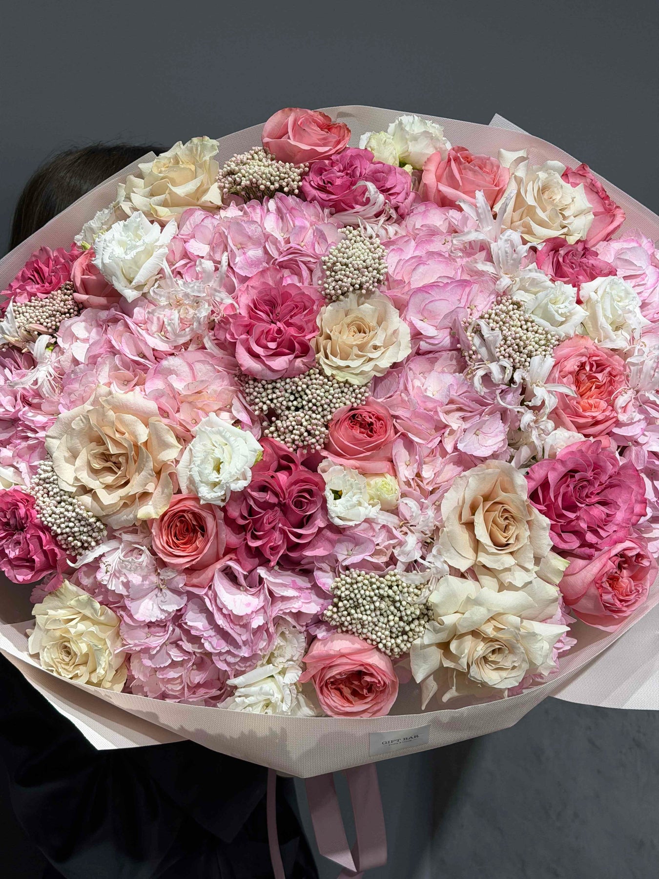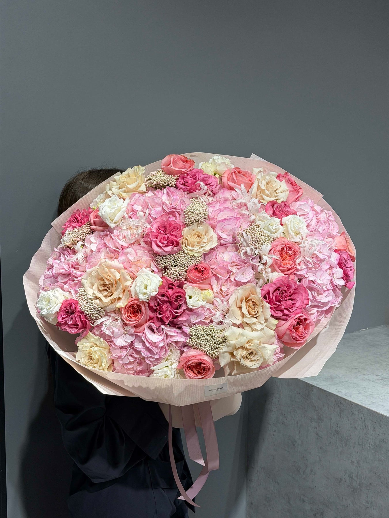 Skład bukietu: hortensja, róża, eustoma, ozothamnus.