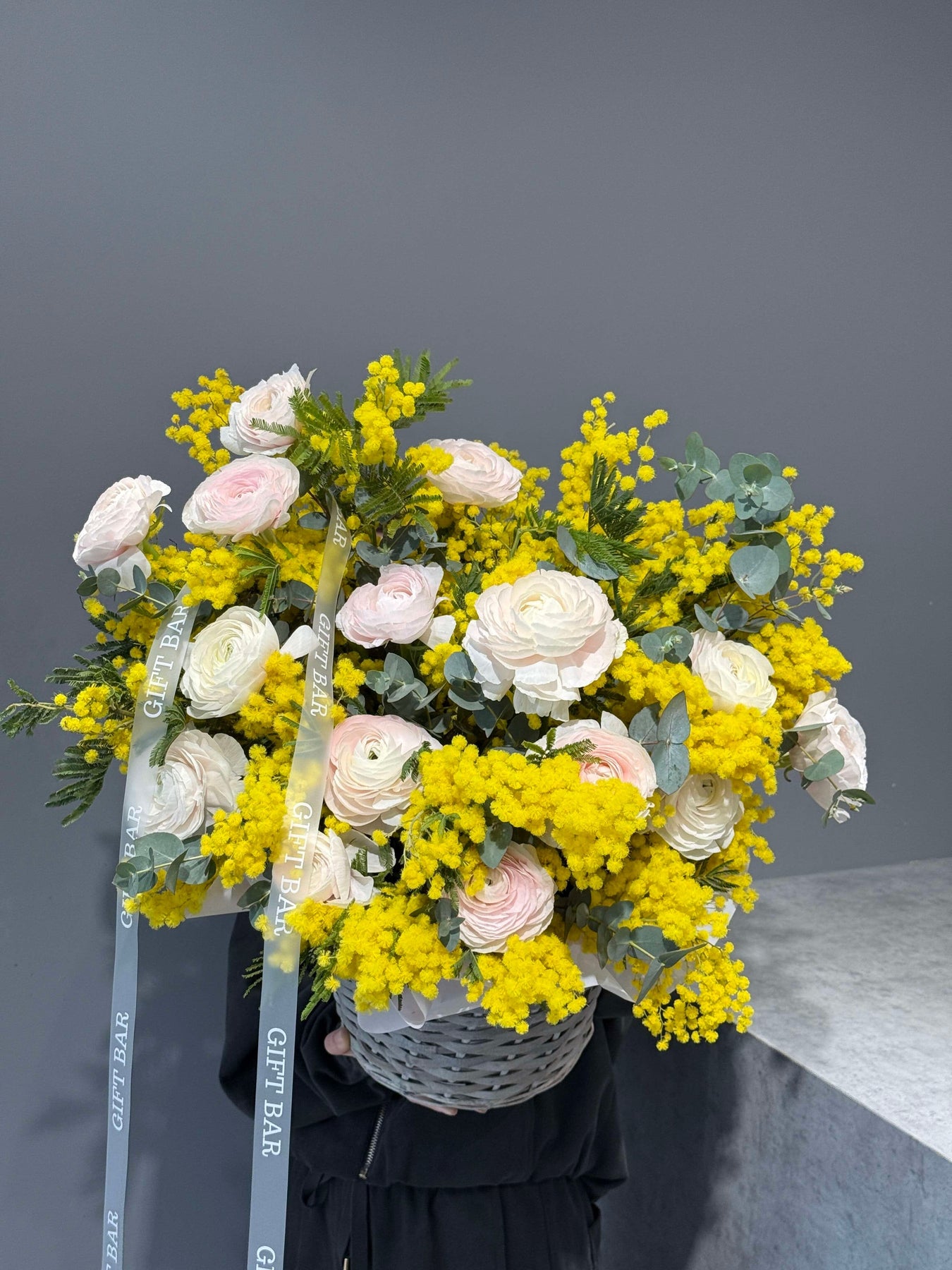 Skład kosza: mimoza, ranunculus, eucalyptus.