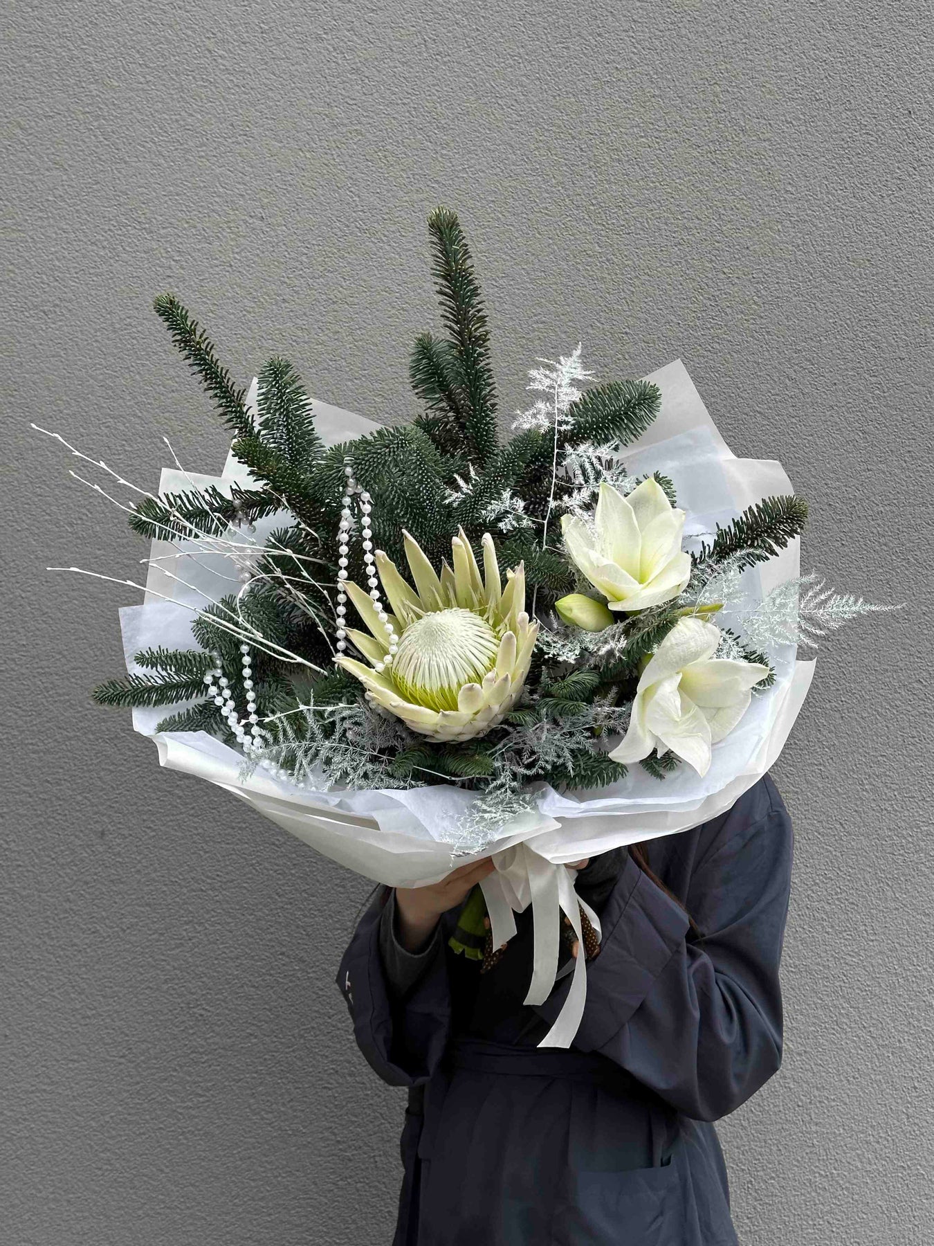 Skład bukietu: nobilis, asparagus, protea, amaryllis, dekoracje.