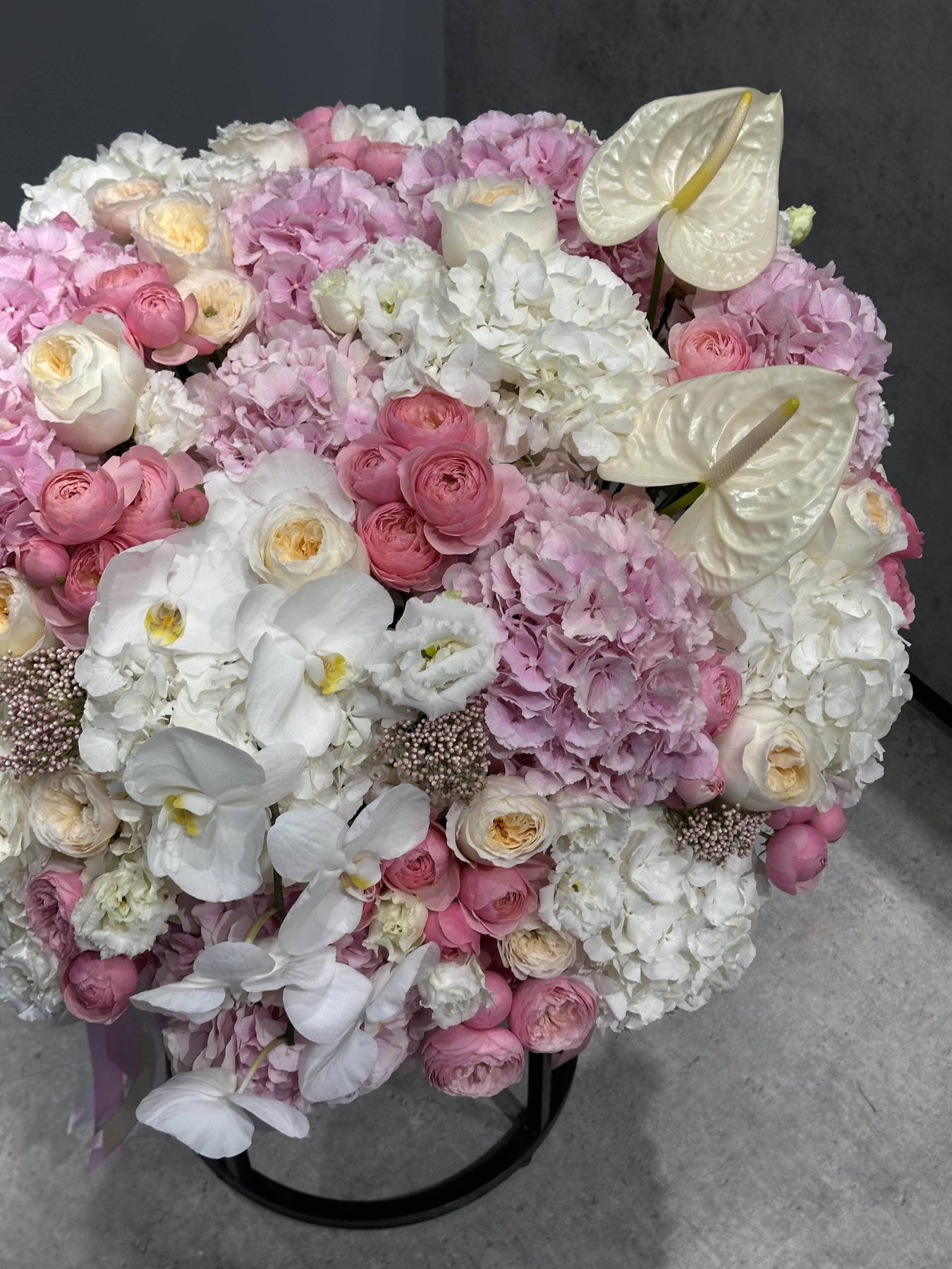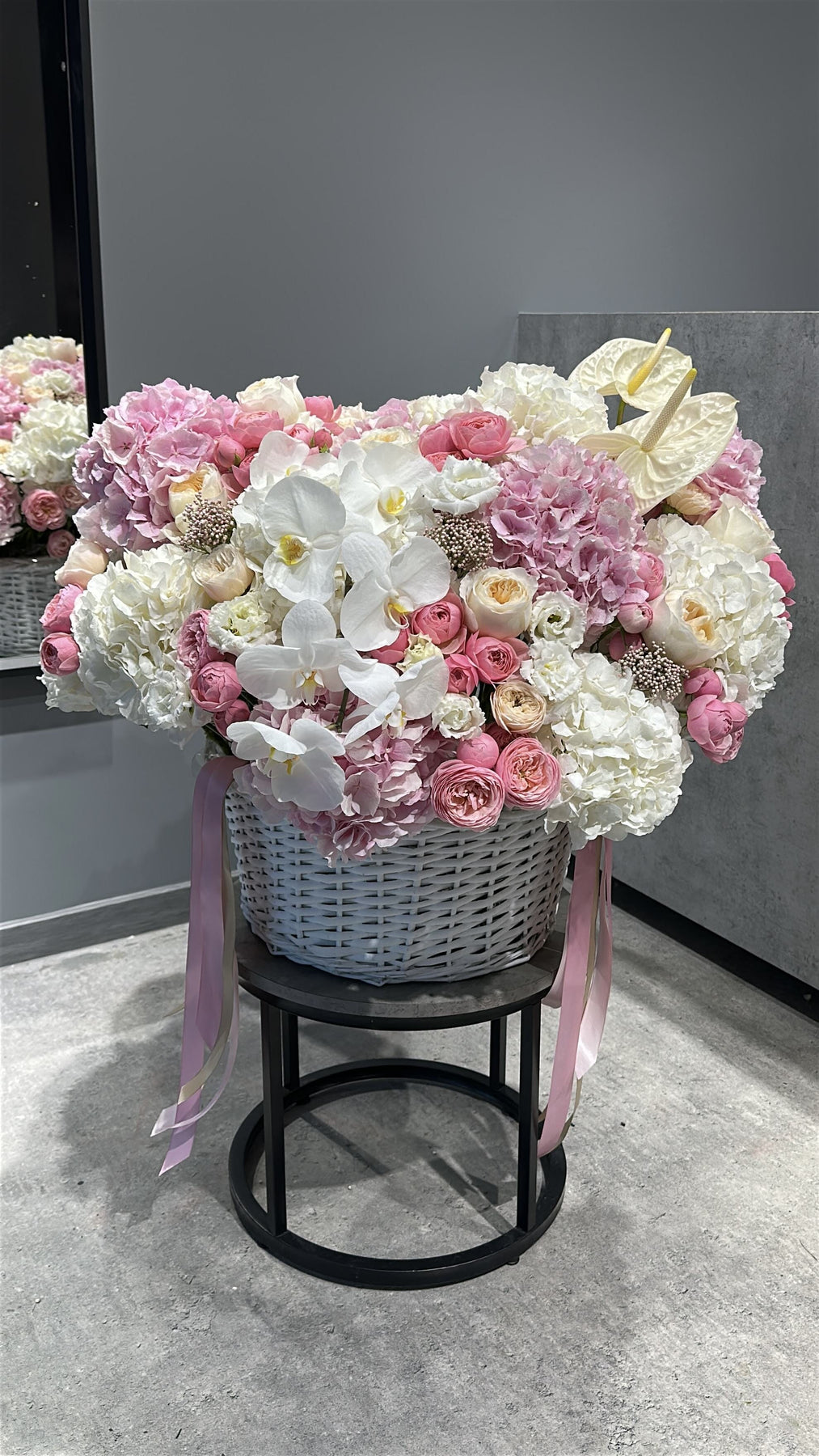 Skład kosza: hortensja, orchidea, anthurium, róża, eustoma, ozothamnus, róża gałązkowa.