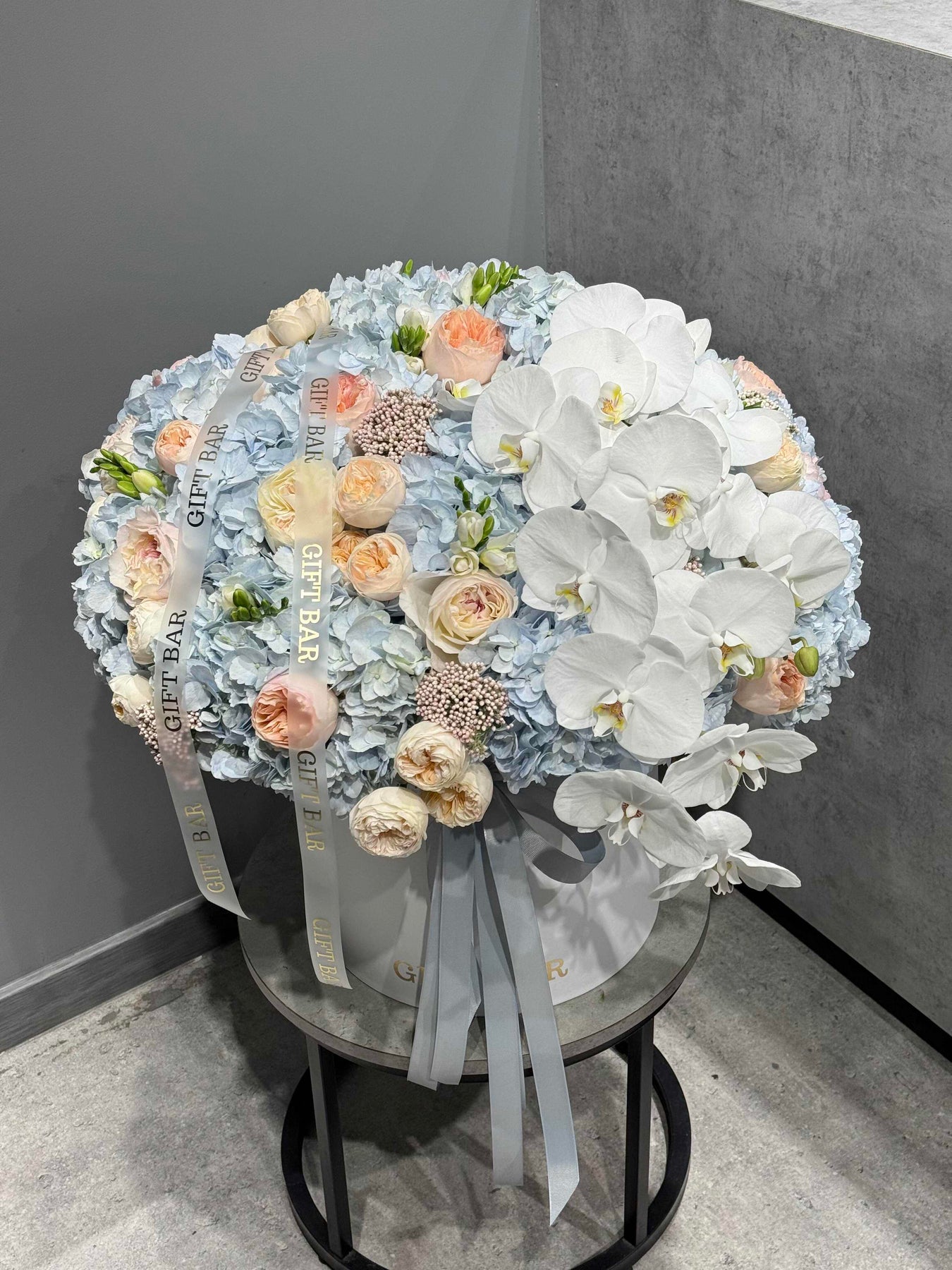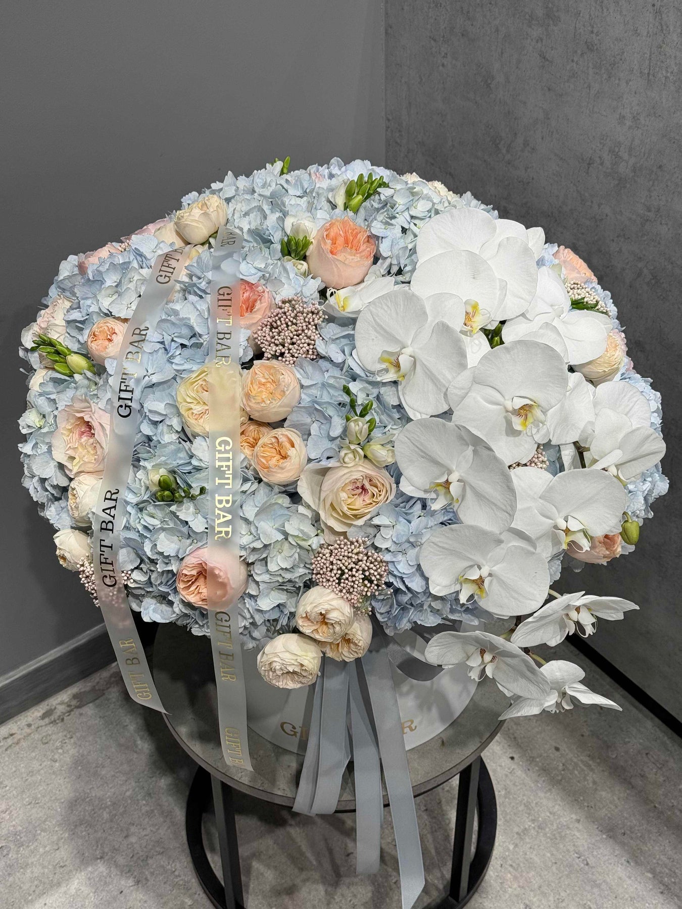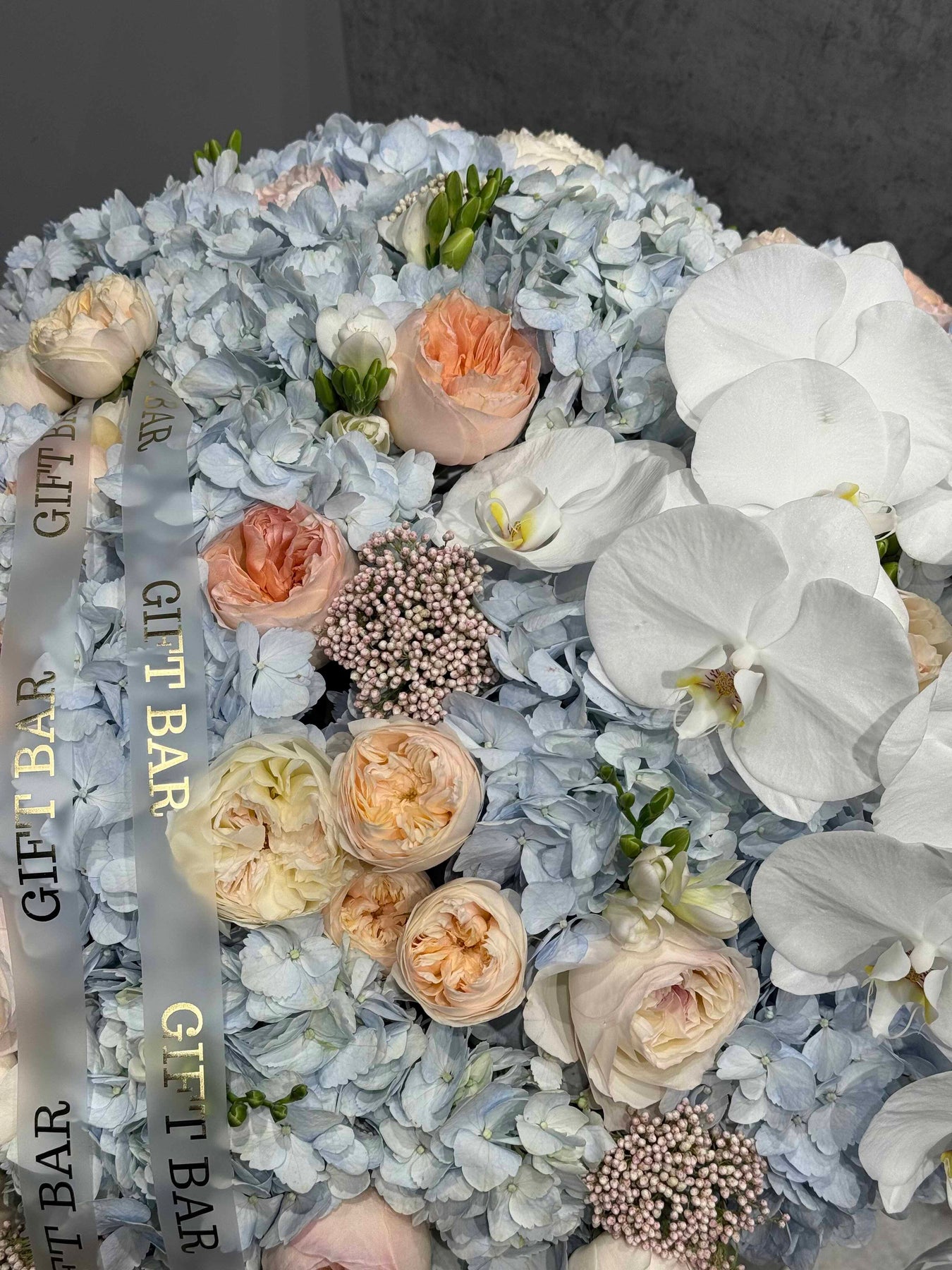 Skład bukietu: Hortensja, róża, orchidea, róża gałązkowa, frezja, ozothamnus.