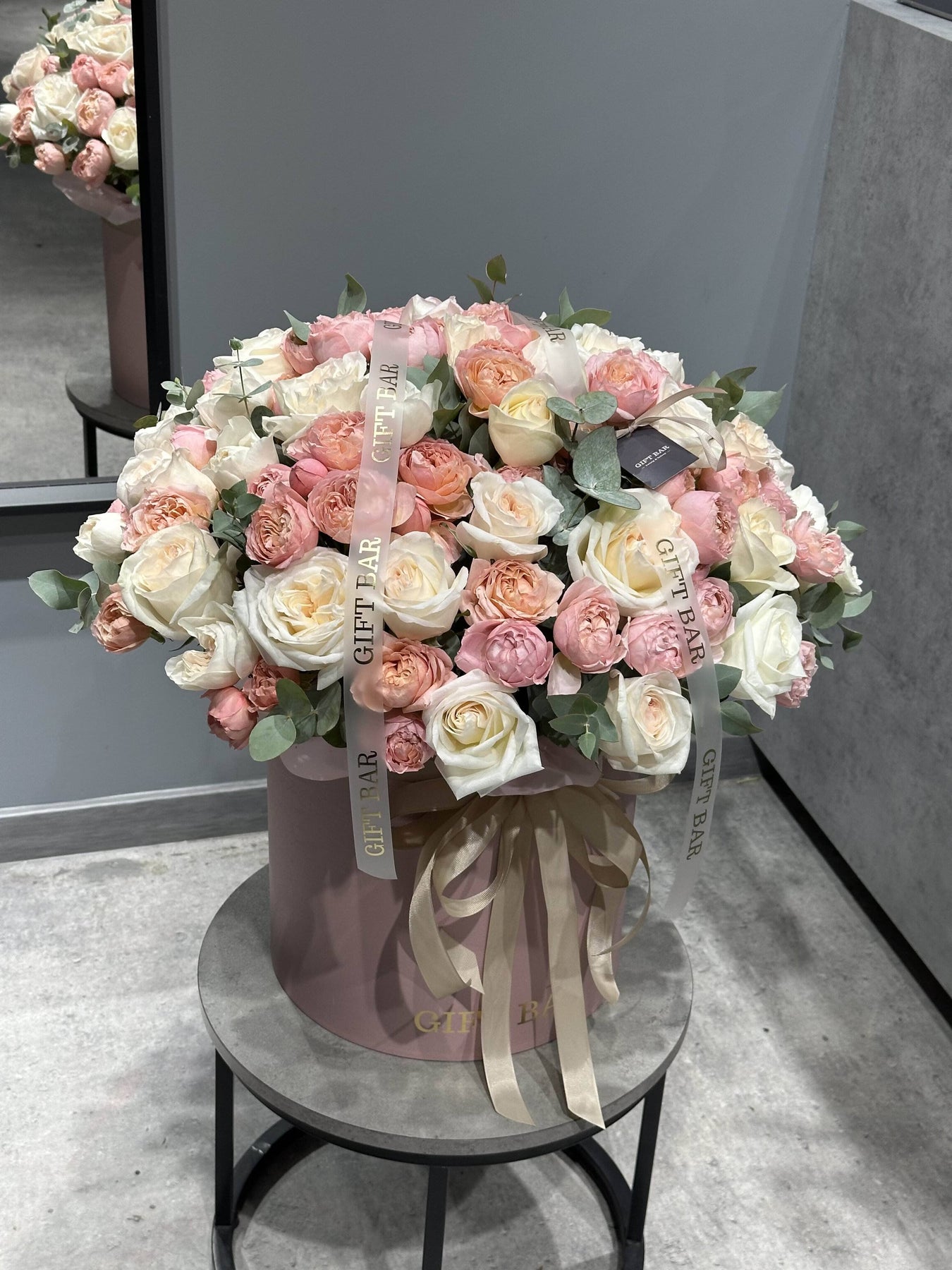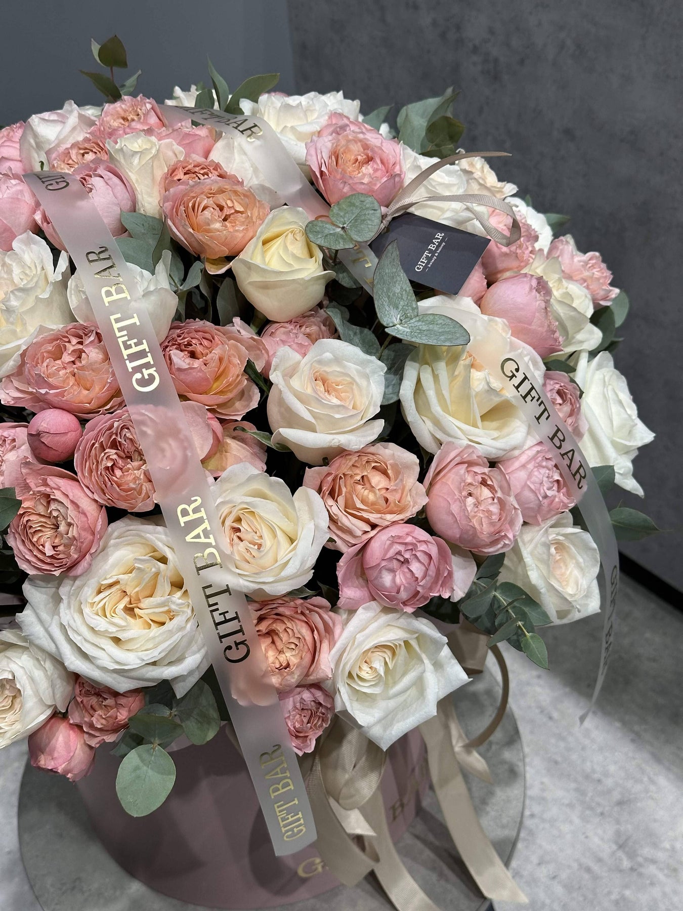 Skład bukietu: róża, róża gałązkowa, eucalyptus.