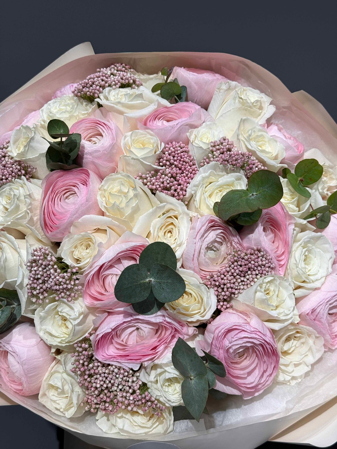 Bouquet composition: rose, ranunculus, ozothamnus, eucalyptus.