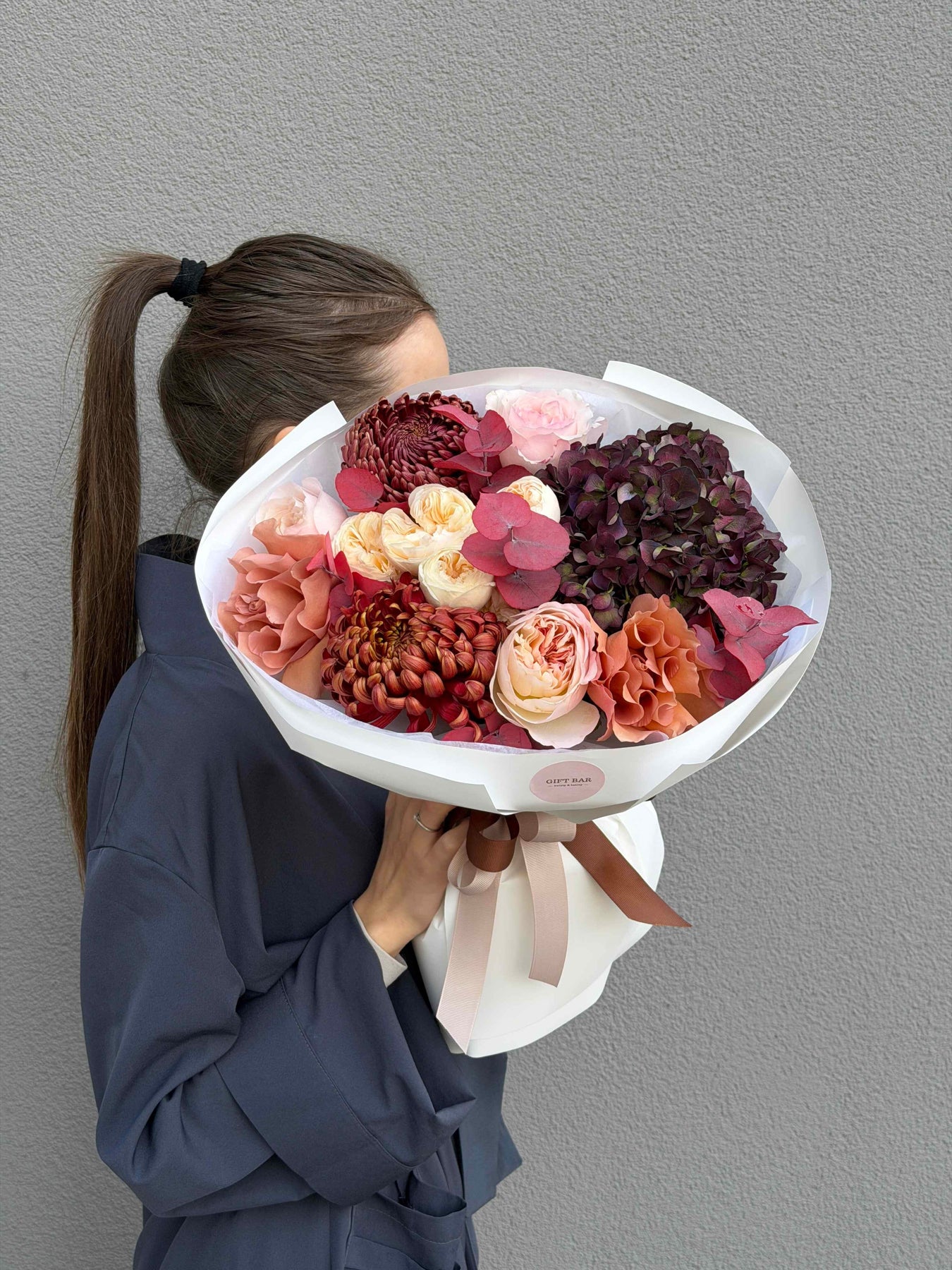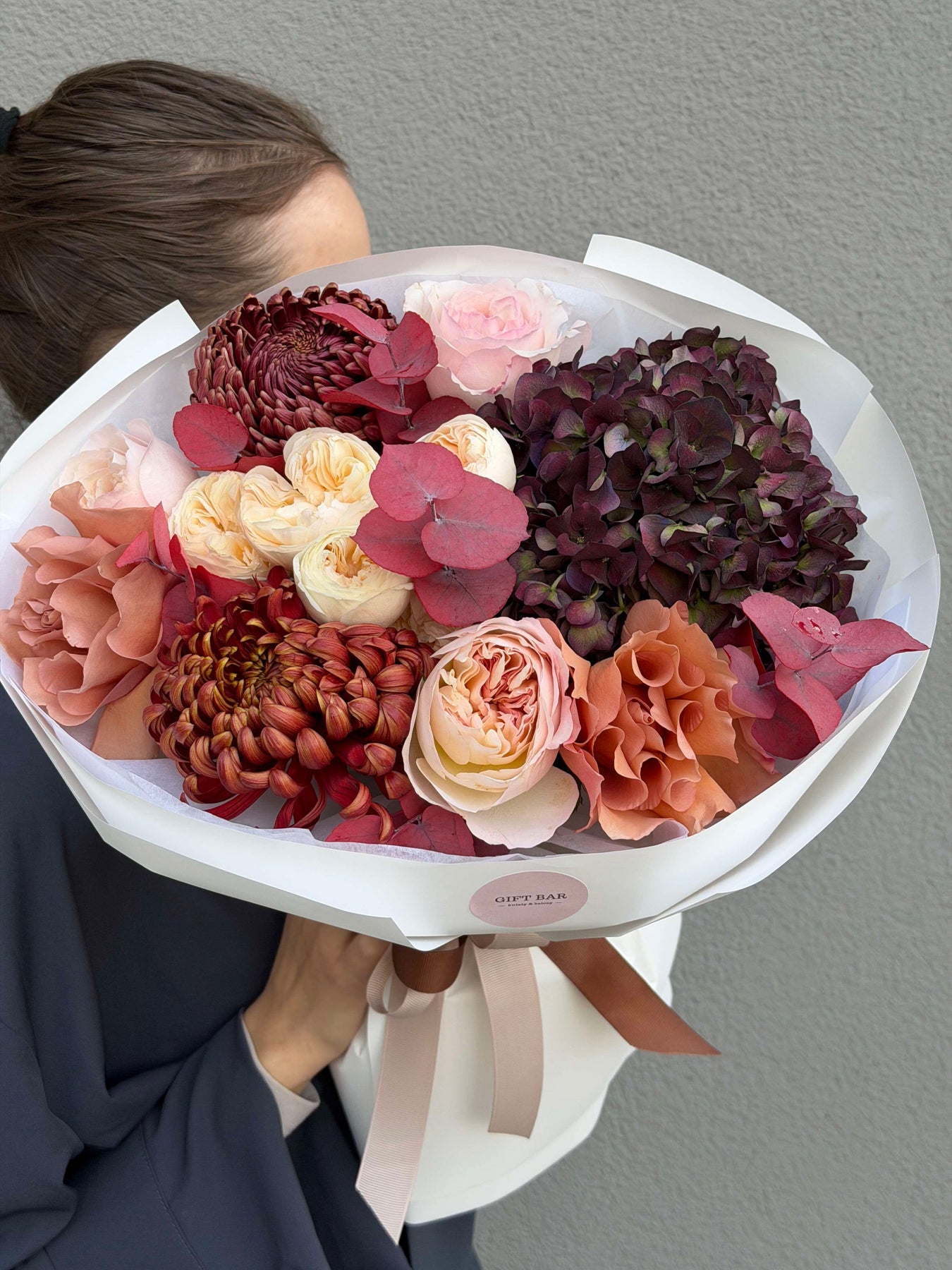 Состав букета: гортензия, роза, кустовая роза, хризантема, эвкалипт.