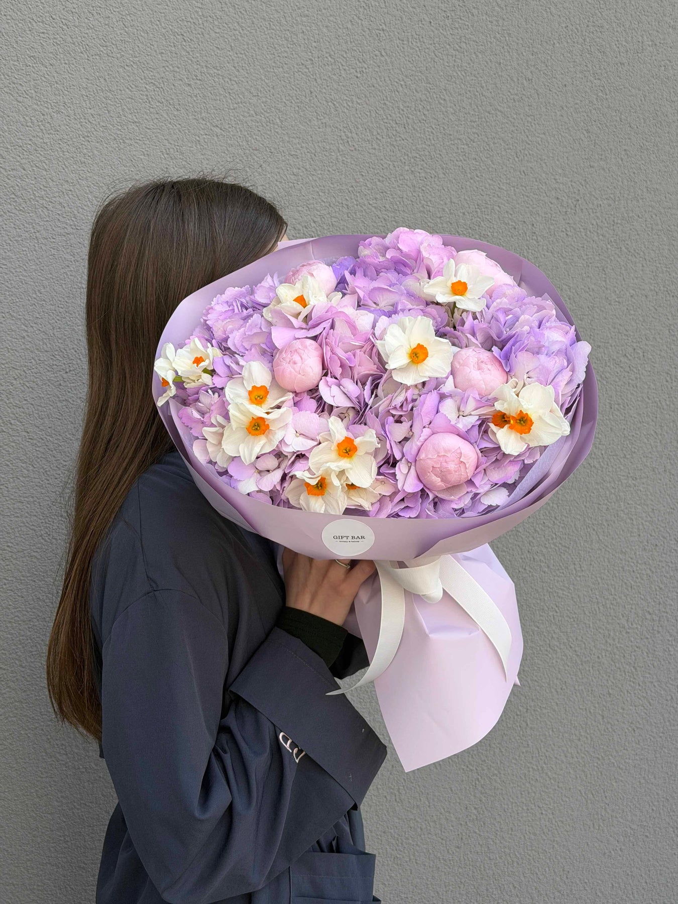 Состав букета: гортензия, роза, нарцисс.