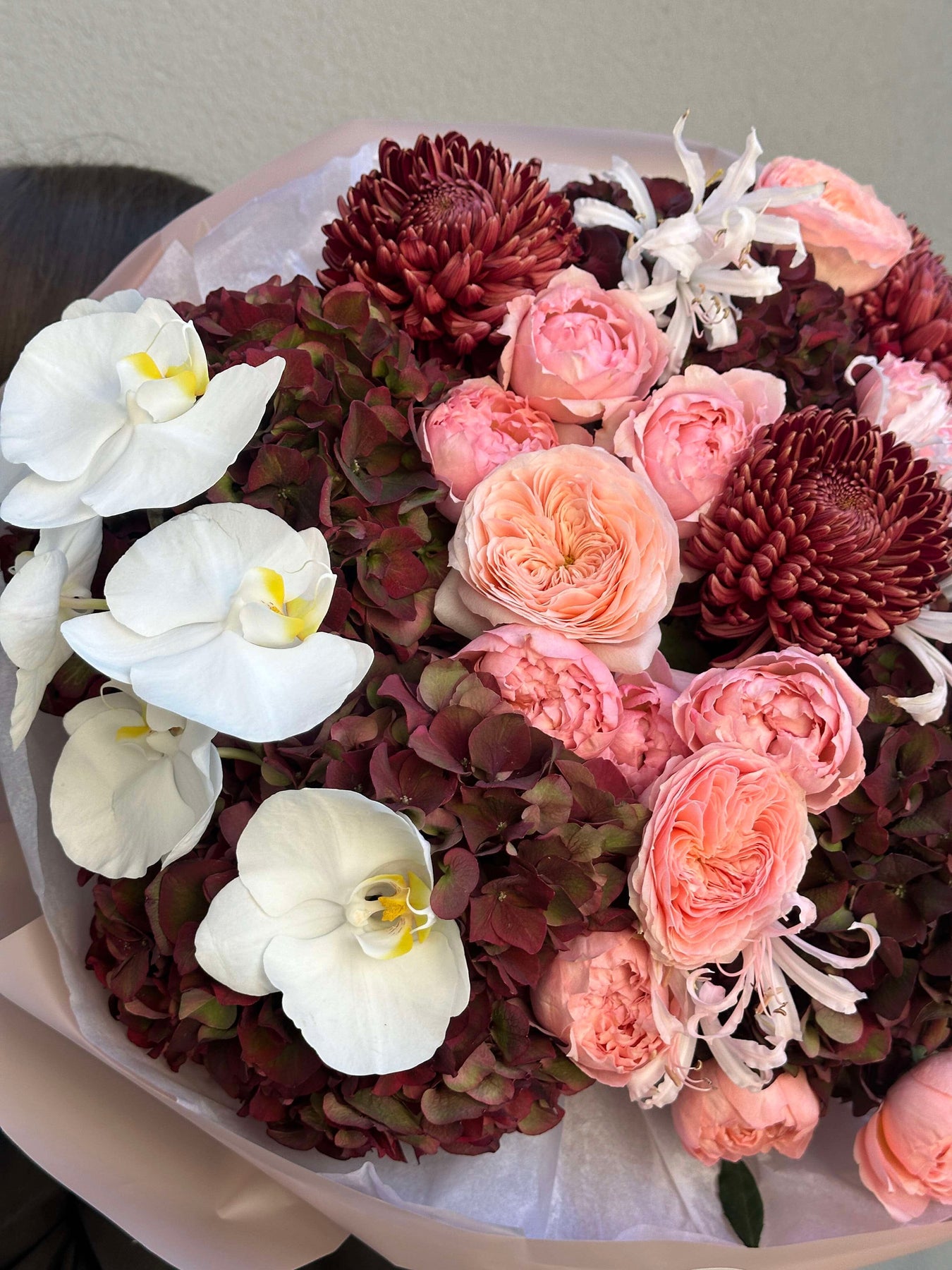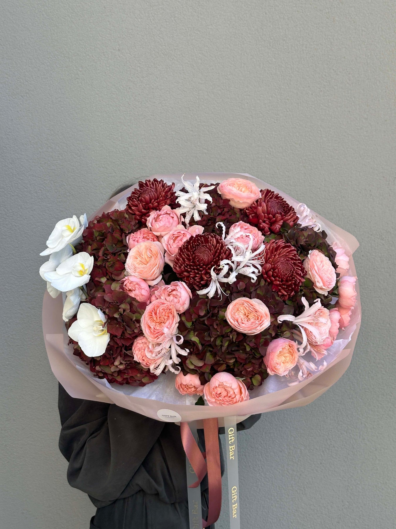 Состав букета: гортензия, роза, кустовая роза, орхидея, нерине, хризантема.