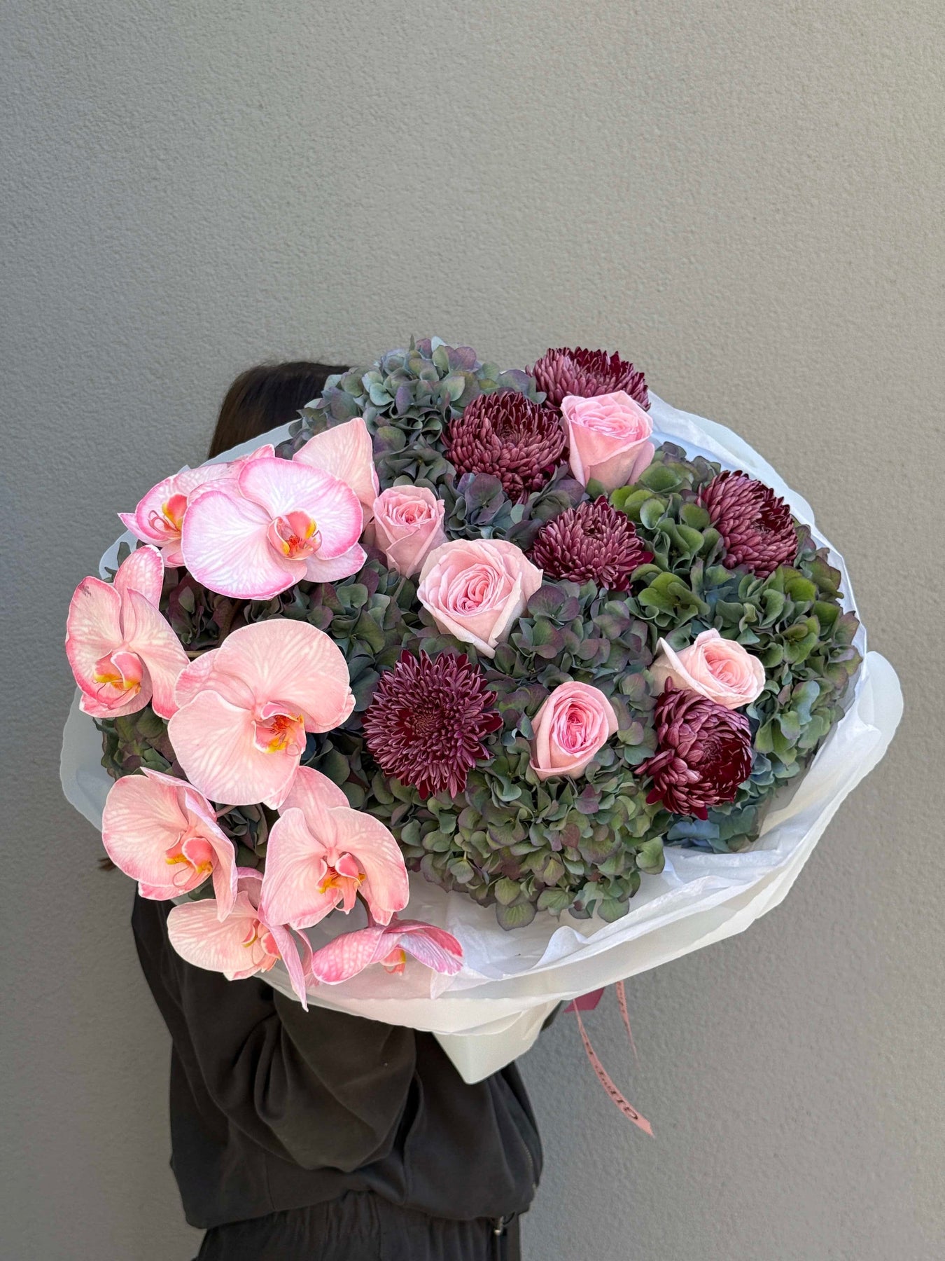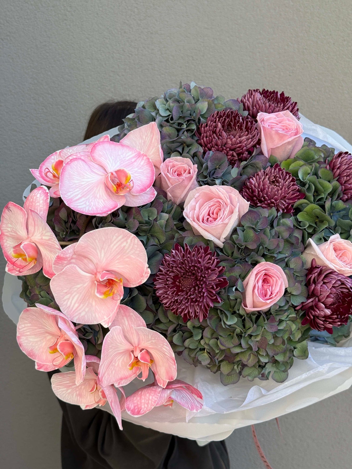 Skład bukietu: hortensja, róża, chryzantema, orchidea.