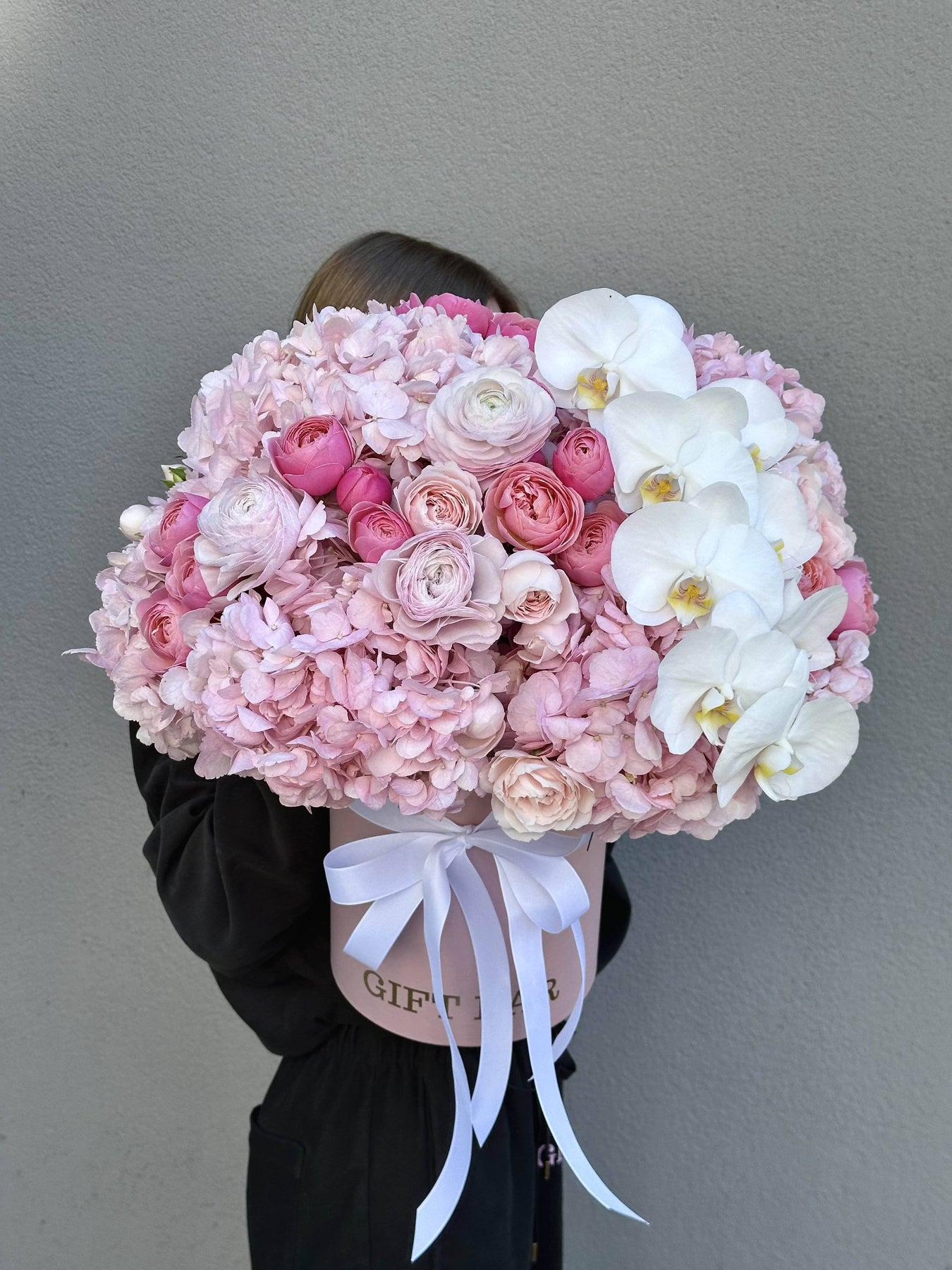 Состав коробки: гортензия, кустовая роза, ранункулюс, орхидея.