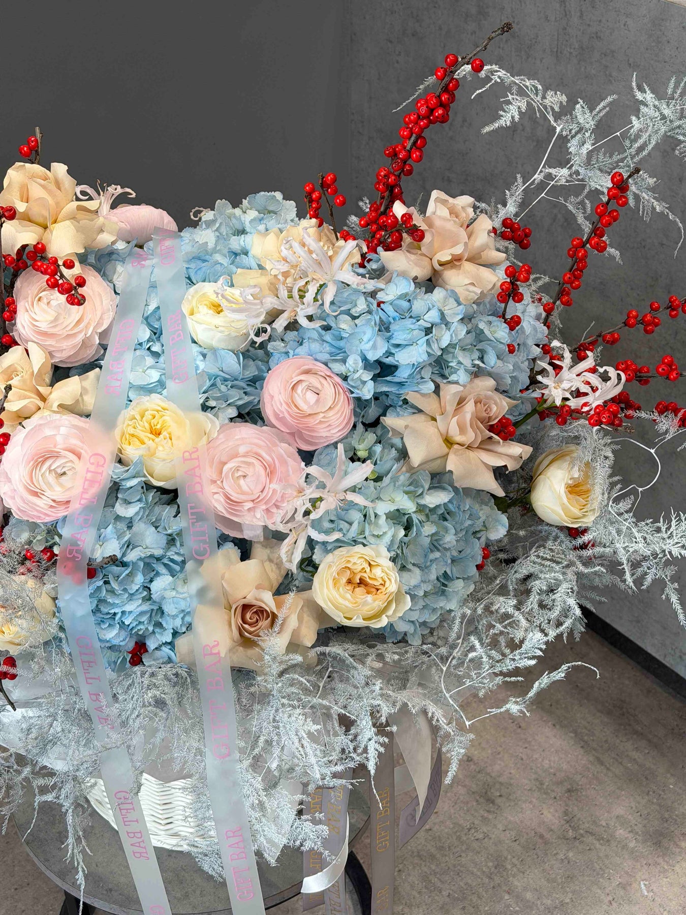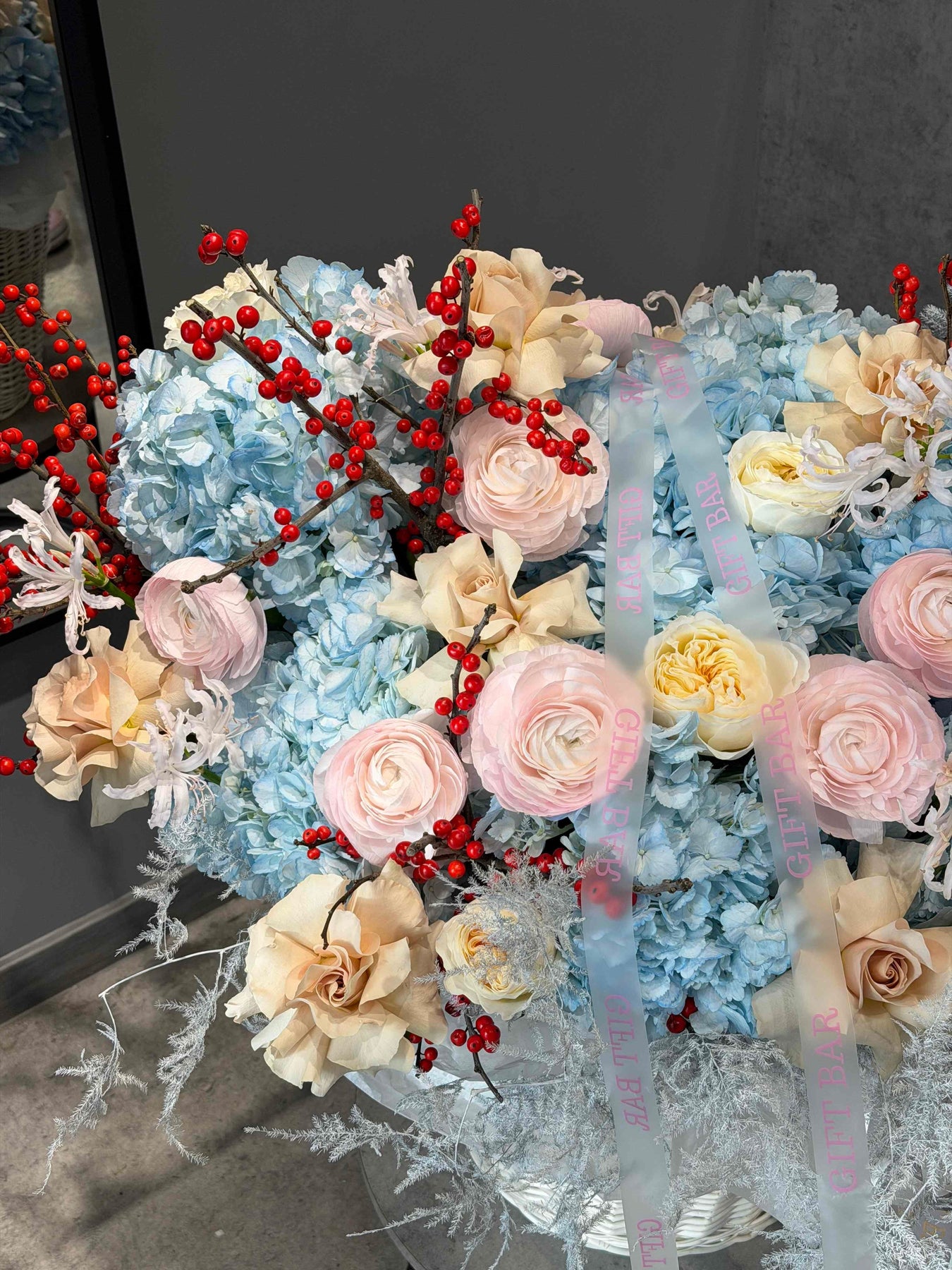 Состав корзины: гортензия, роза, нерине, ранункулюс, илекс, аспарагус.