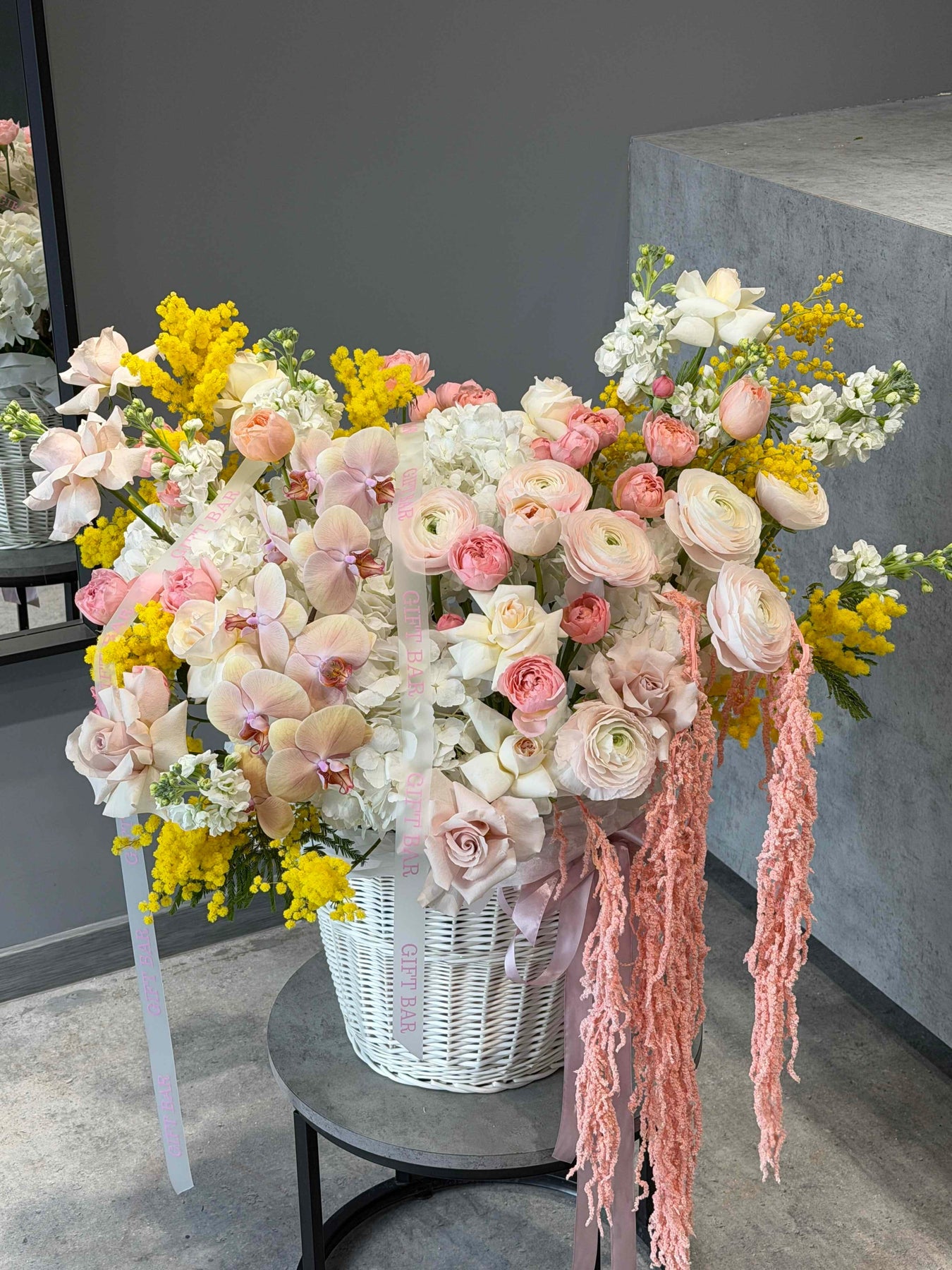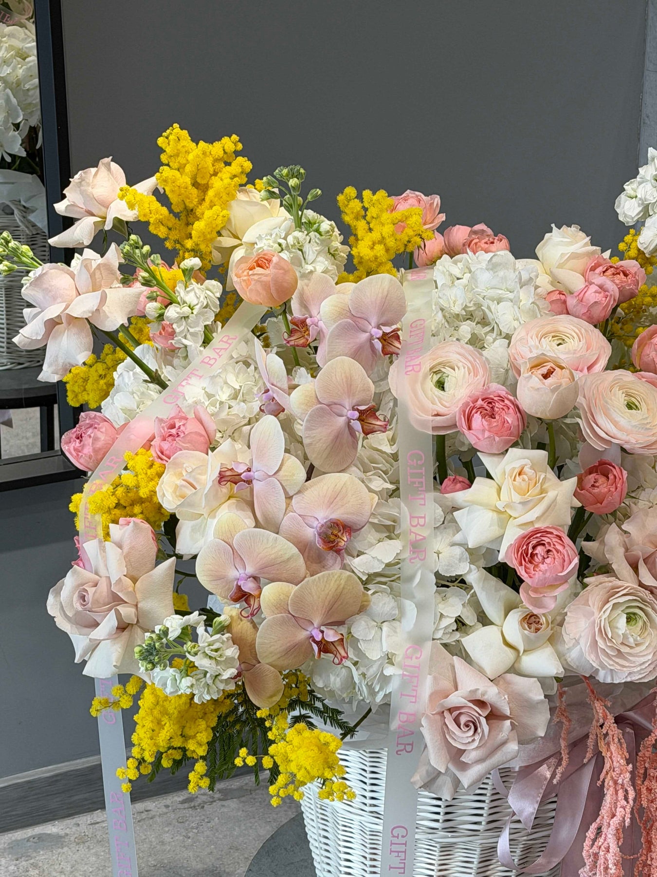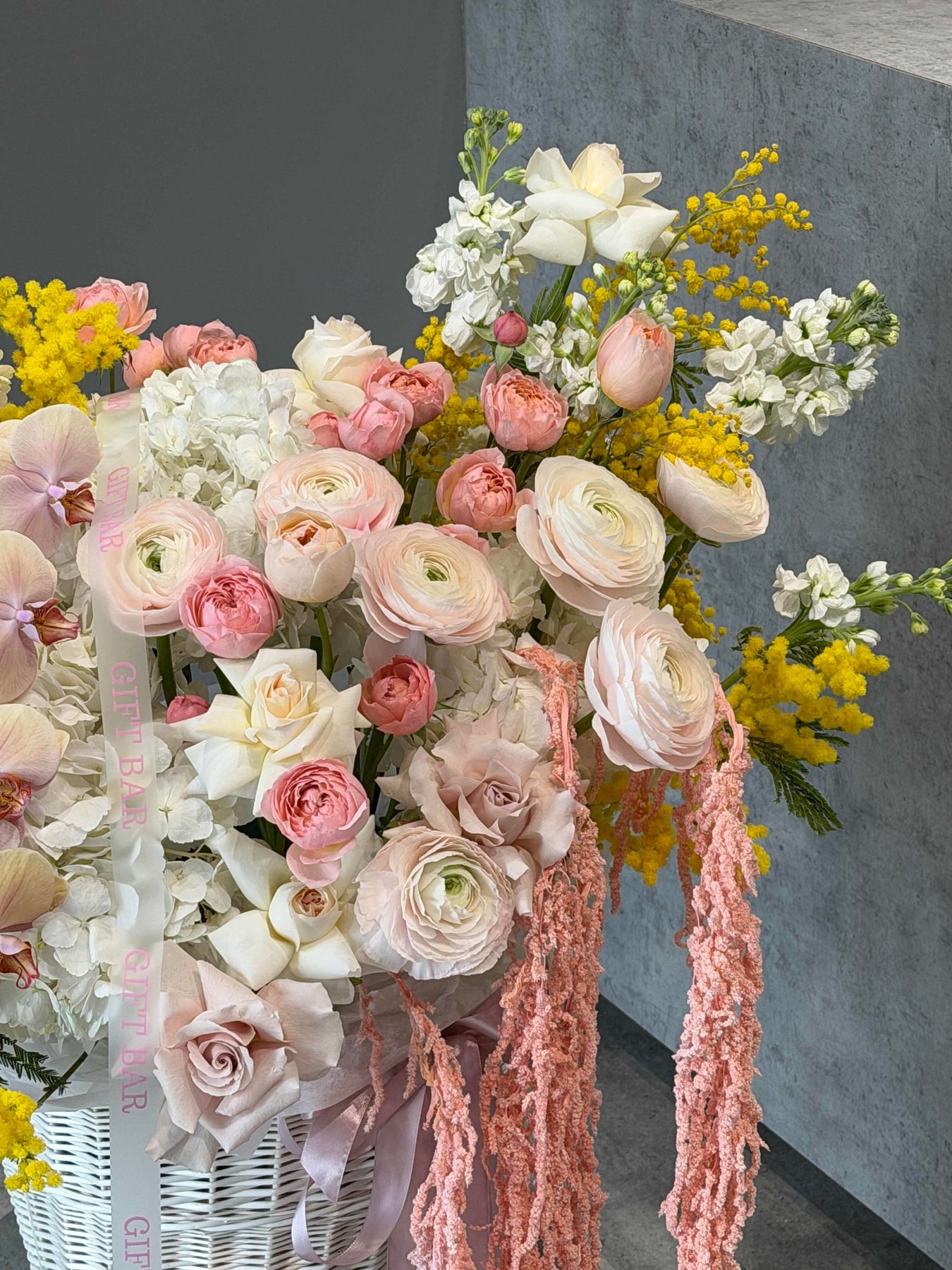 Состав корзины: гортензия, роза, ранункулюс, орхидея, мимоза, матиола, кустовая роза, амаранту.